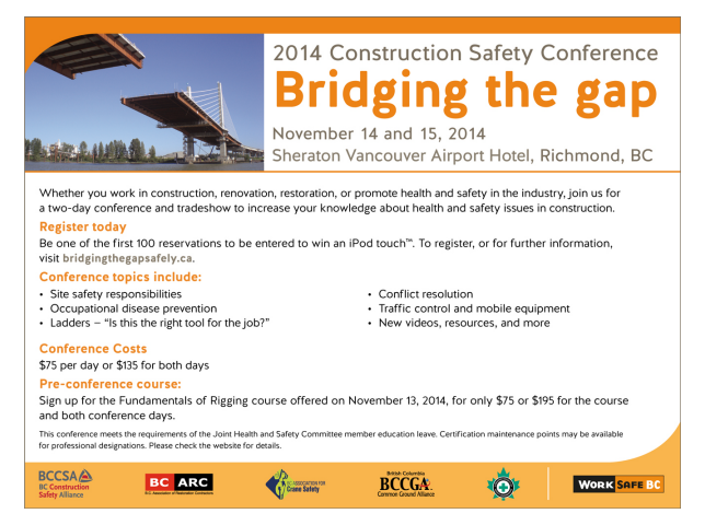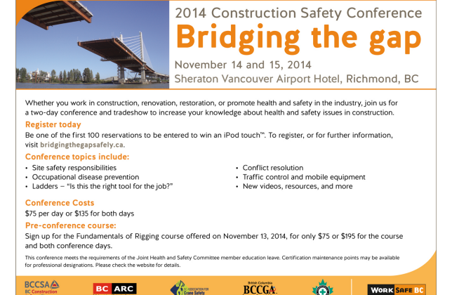 The 9th annual Bridging the Gap conference is a two-day conference on safety in the construction industry. The all plenary sessions will include on site safety responsibilities and supervision, occupational disease prevention (asbestos and silica), alternatives to ladders, MSI prevention and return to work, traffic control and mobile equipment, and more.