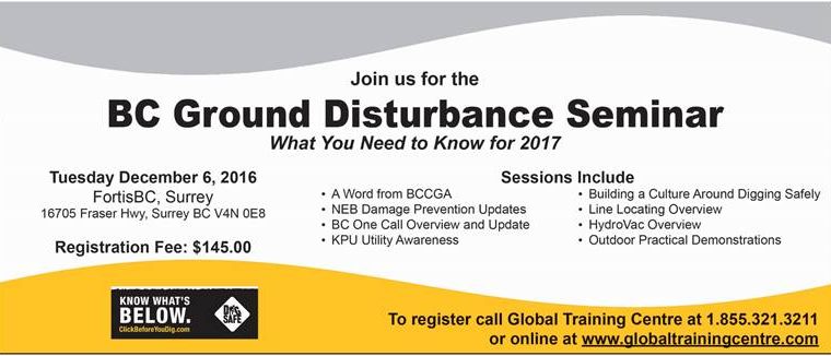 BC Ground Disturbance Seminar – December 6th – Only a few seats left! November 30, 2016 News See the full agenda and register for our BC Ground Disturbance Seminar NOW! Booth space is available too! Contact Global Training Centre for details.